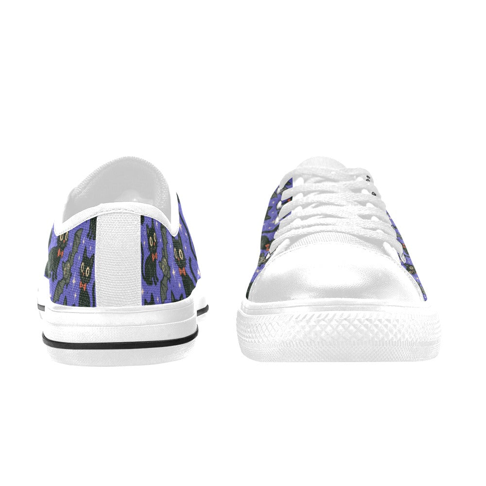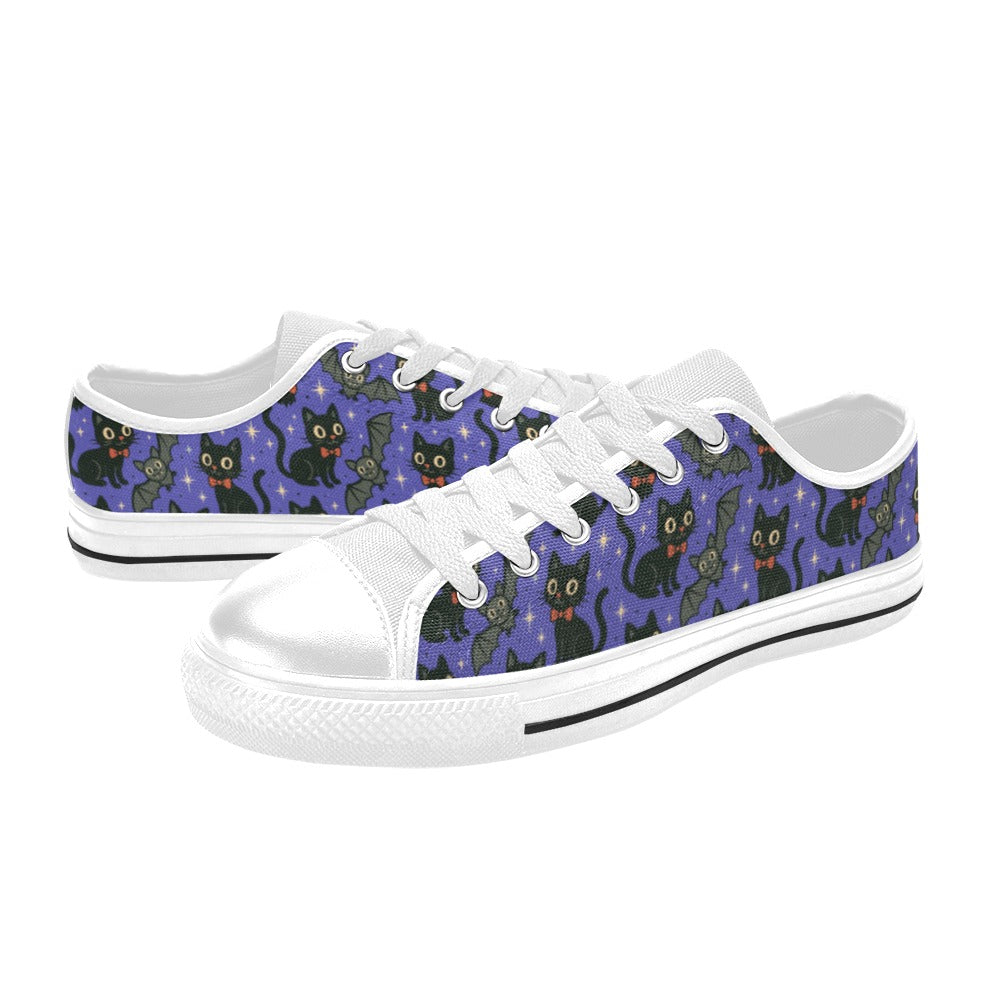 Let your little one step into spooky-cute style with our Spooky Cats n Bats Kids Sneakers! Featuring playful black cats with bow ties, wide-eyed bats, and a purple starry sky, these comfy canvas sneakers add a dash of Halloween charm to everyday outfits.