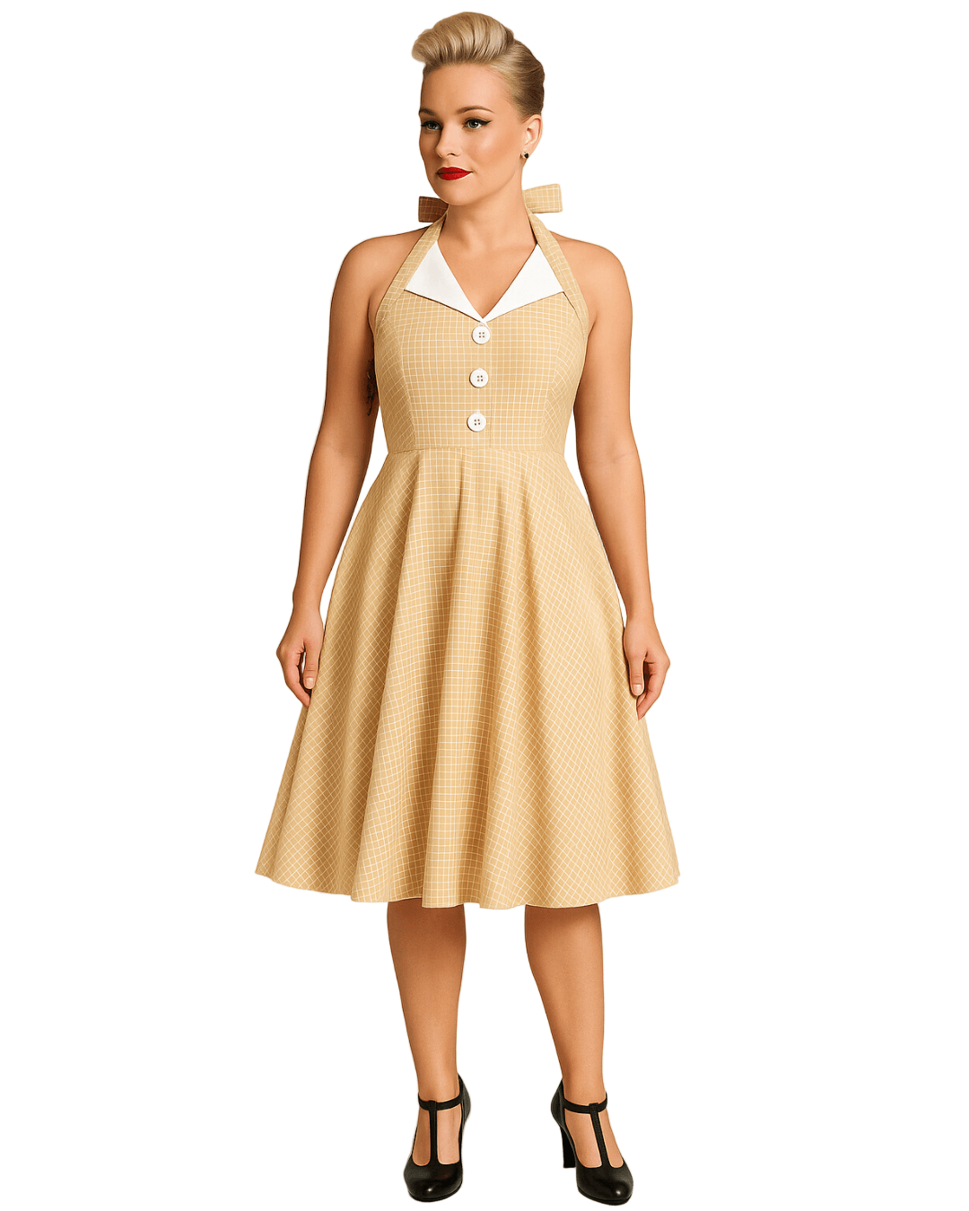 Turn heads this summer in this vintage-inspired beige halter swing dress. Featuring a playful white check pattern on textured poplin-style fabric, this dress combines retro charm with modern comfort. The halter neckline ties at the neck, while the V-shaped collar and front buttons add a polished finish.