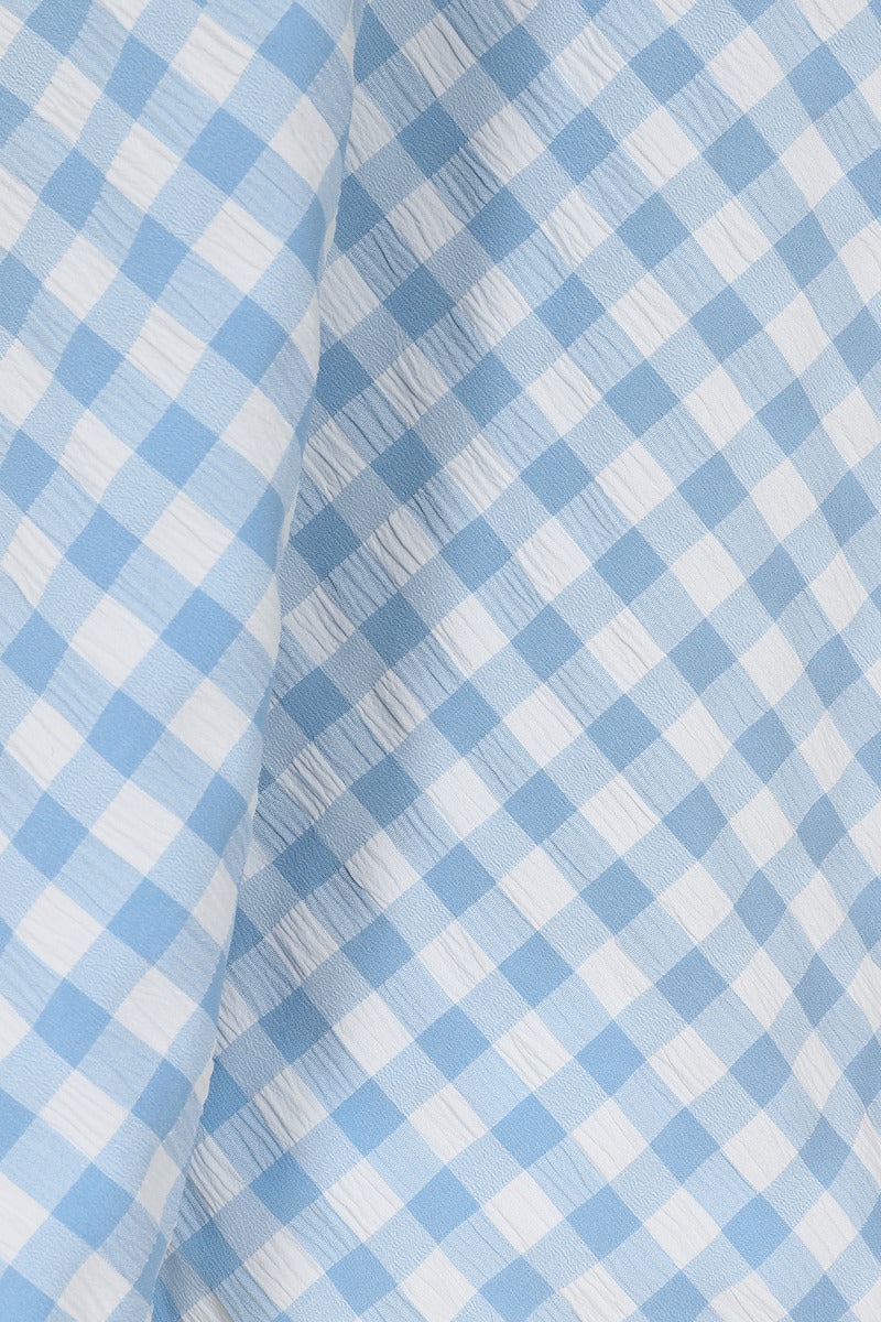 Woman wearing a blue and white checkered dress on a plain background