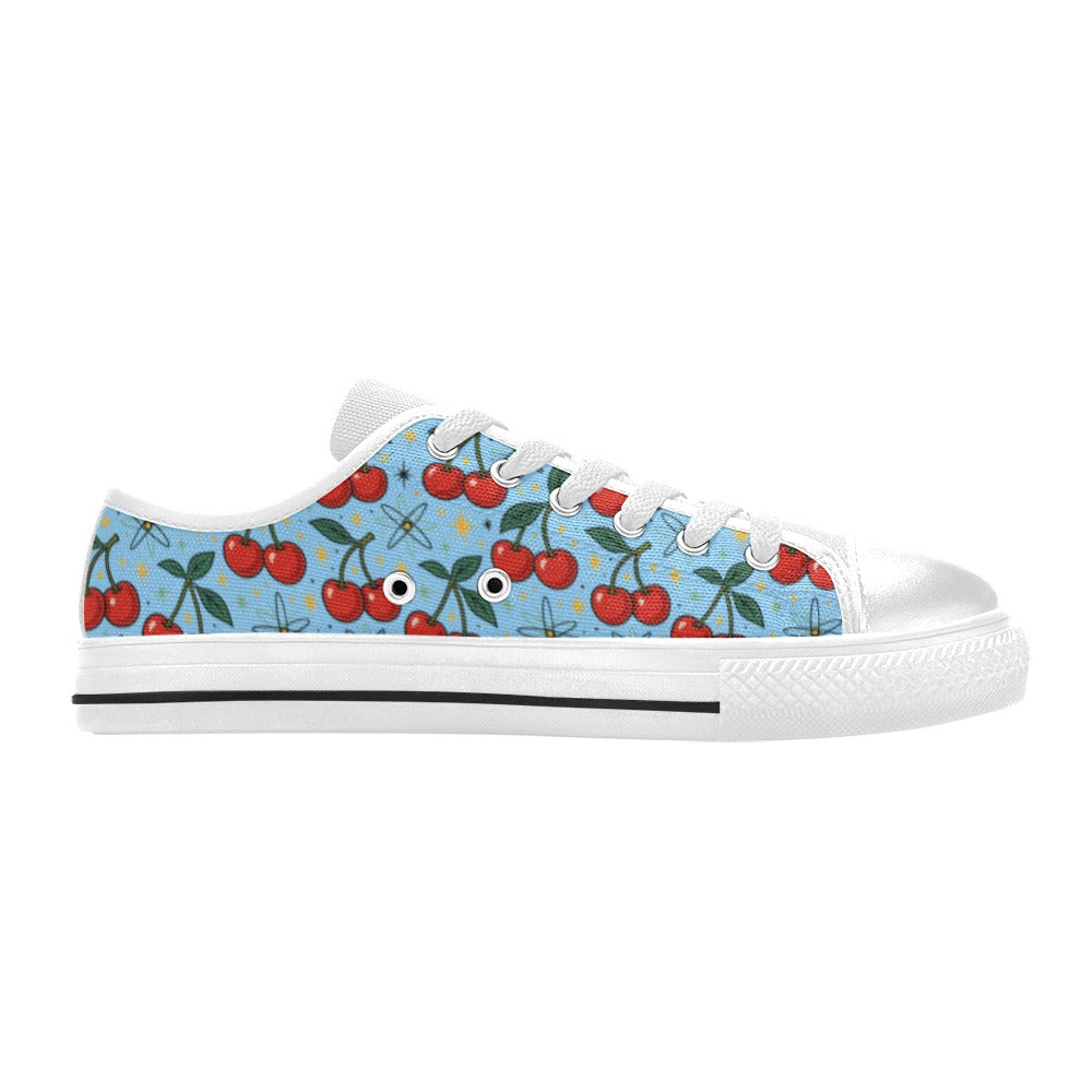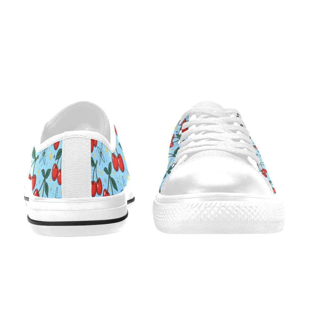 Atomic Cherries Womens Sneakers featuring a playful cherry design on a sky-blue canvas background.
