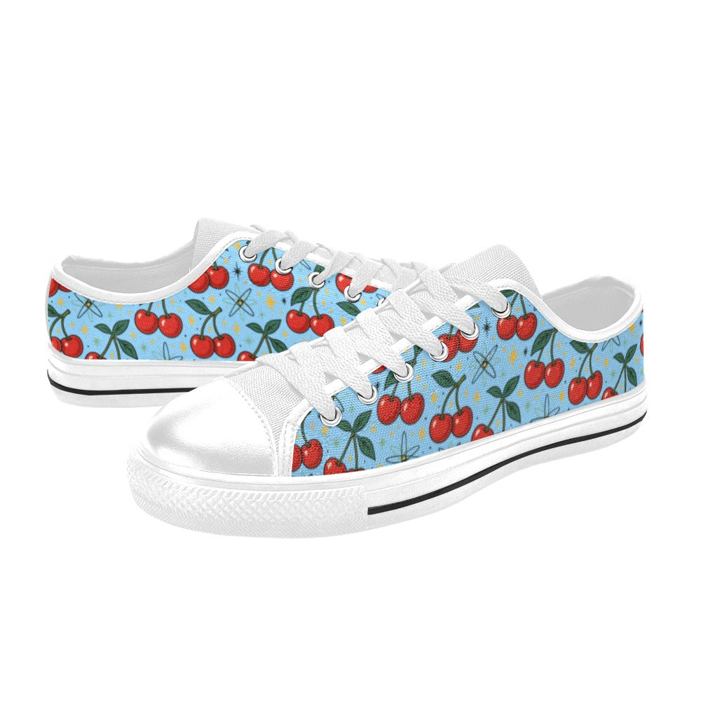 Atomic Cherries Womens Sneakers featuring a fun cherry and starburst design on sky-blue canvas.