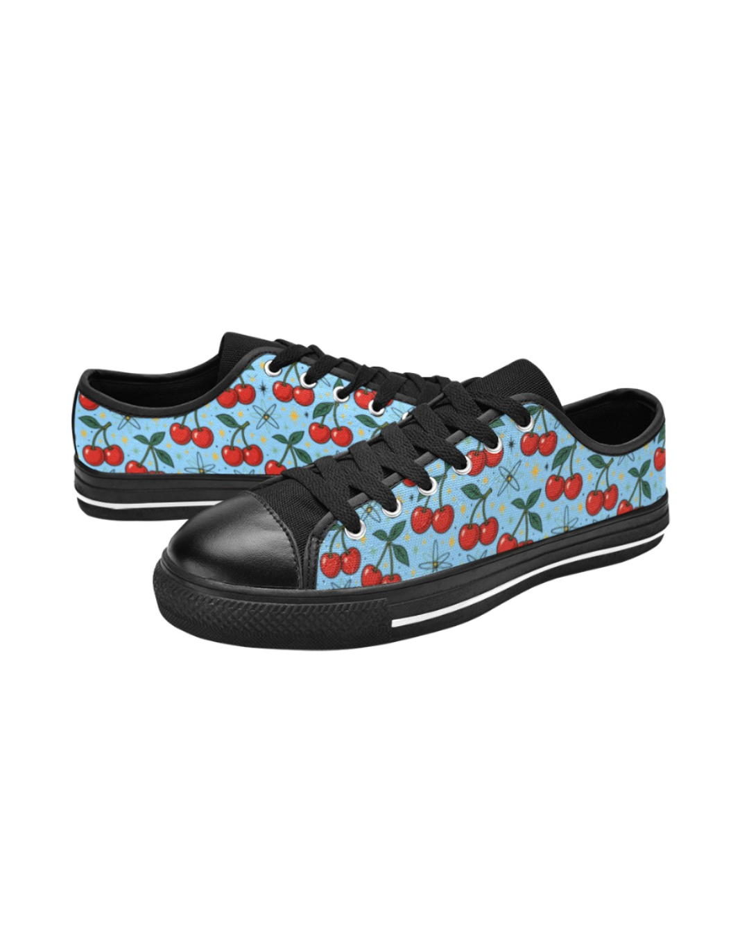 Atomic Cherries (B) Womens Sneakers featuring bright red cherries on a sky-blue canvas with black trim.