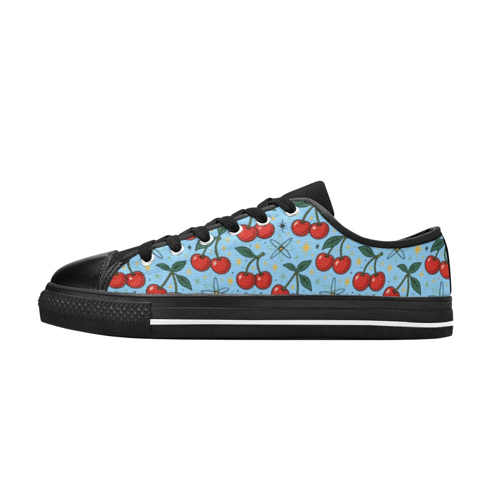 Atomic Cherries (B) Womens Sneakers feature sky-blue canvas with red cherries and black trim, perfect for a retro look.