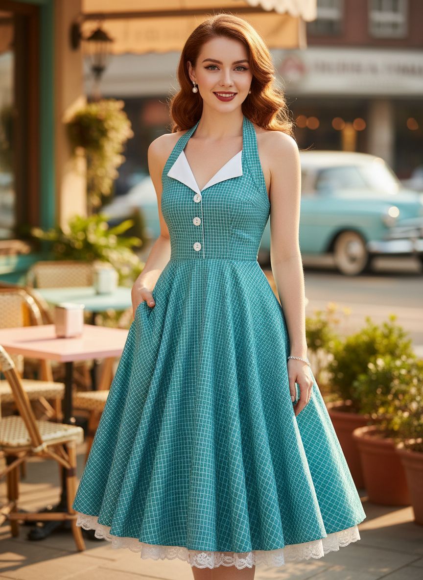 Turn heads this summer in this vintage-inspired teal halter swing dress. Featuring a playful white check pattern on textured poplin-style fabric, this dress combines retro charm with modern comfort. The halter neckline ties at the neck, while the V-shaped collar and front buttons add a polished finish.