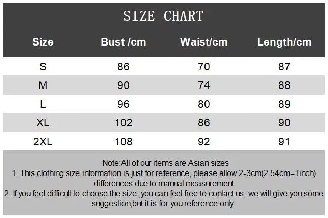 | Size | Bust (cm) | Waist (cm) | Length (cm) |