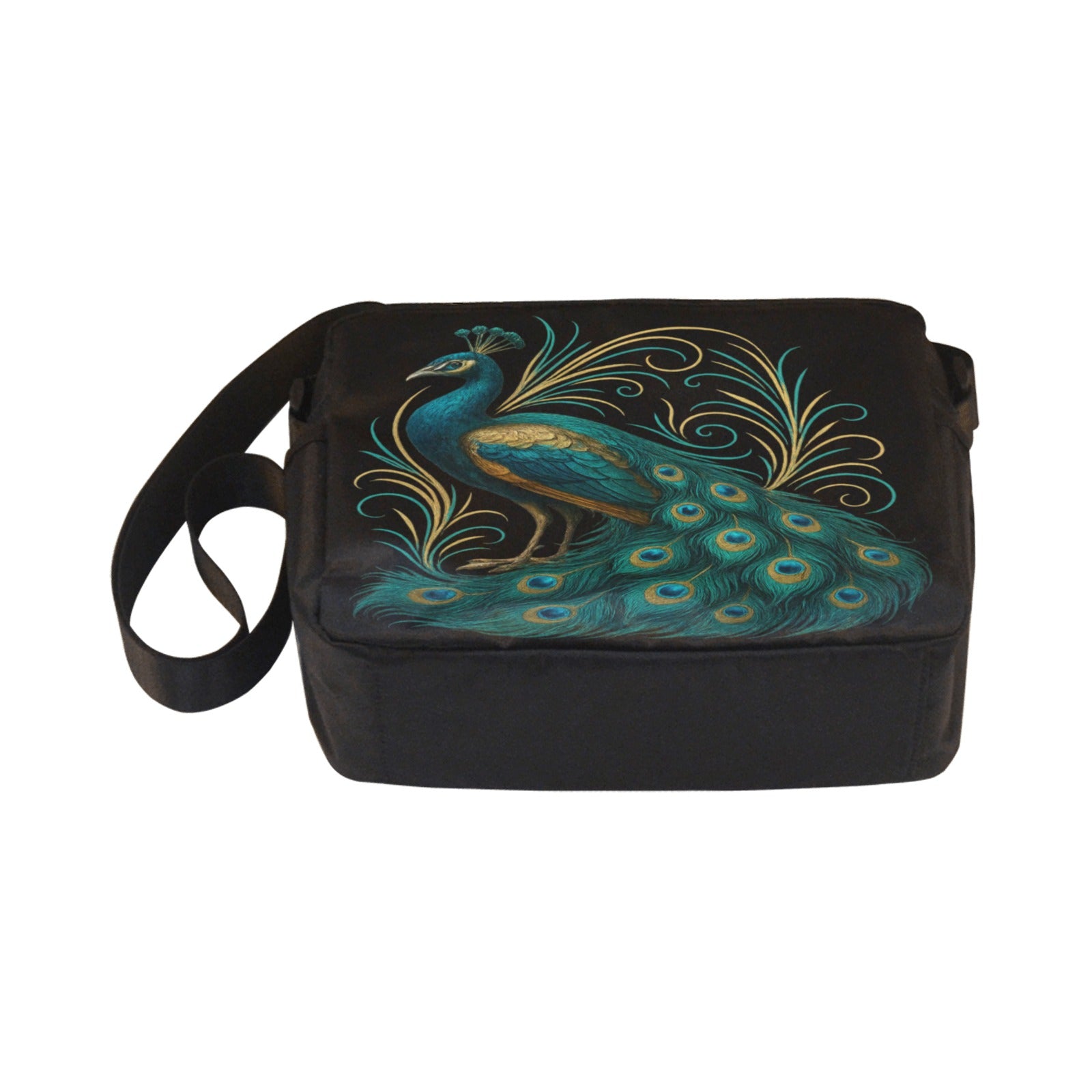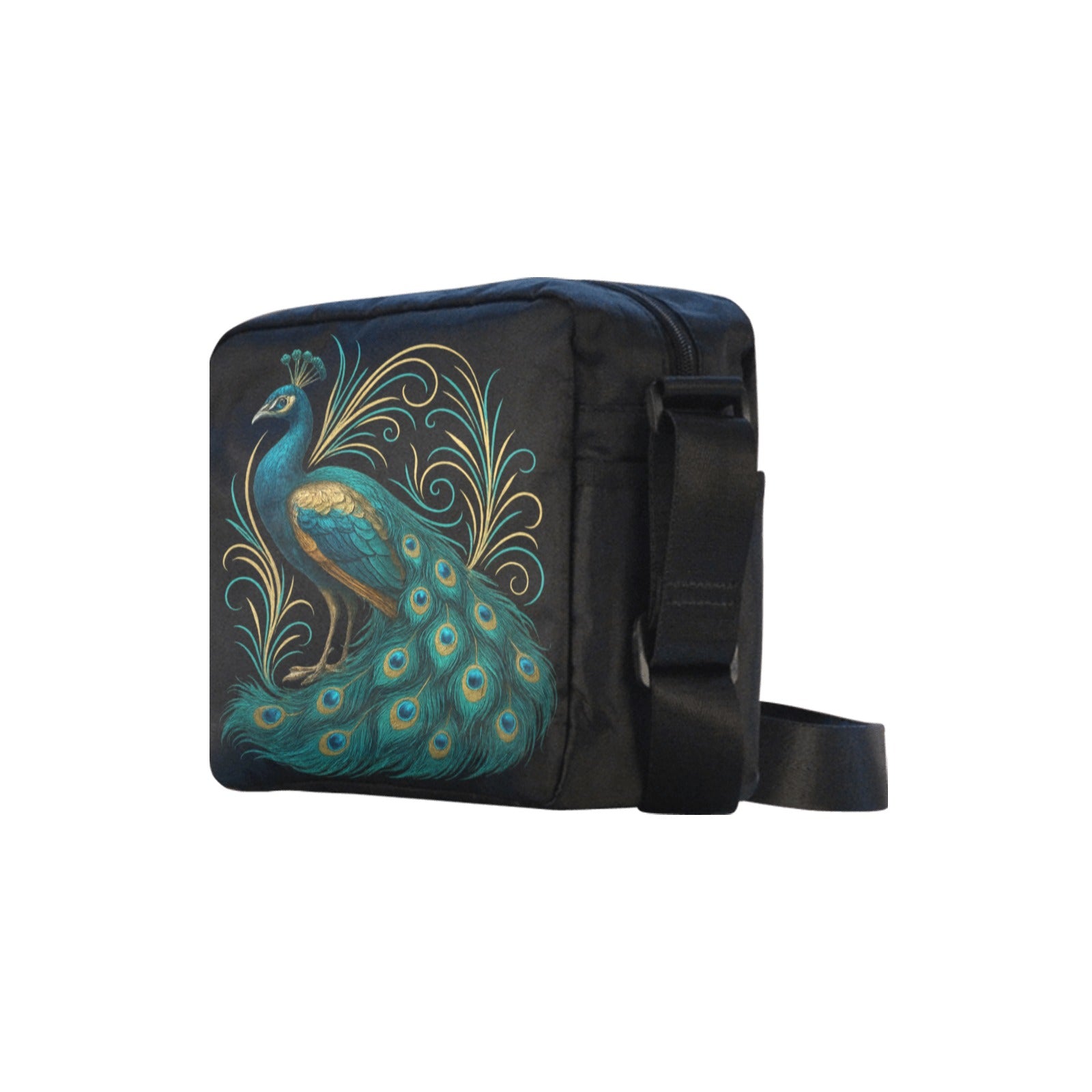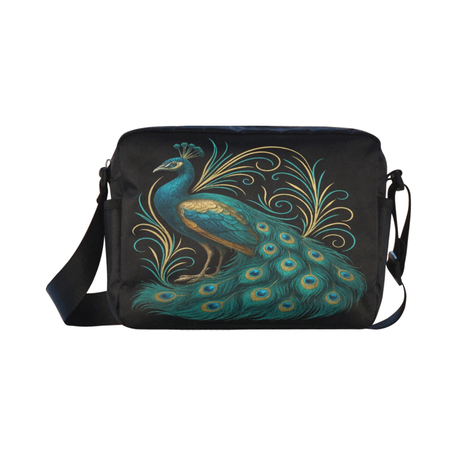 The Gilded Peacock Crossbody Bag – vintage-inspired crossbody featuring elegant peacock artwork with metallic gold accents and teal, emerald, and sapphire tones